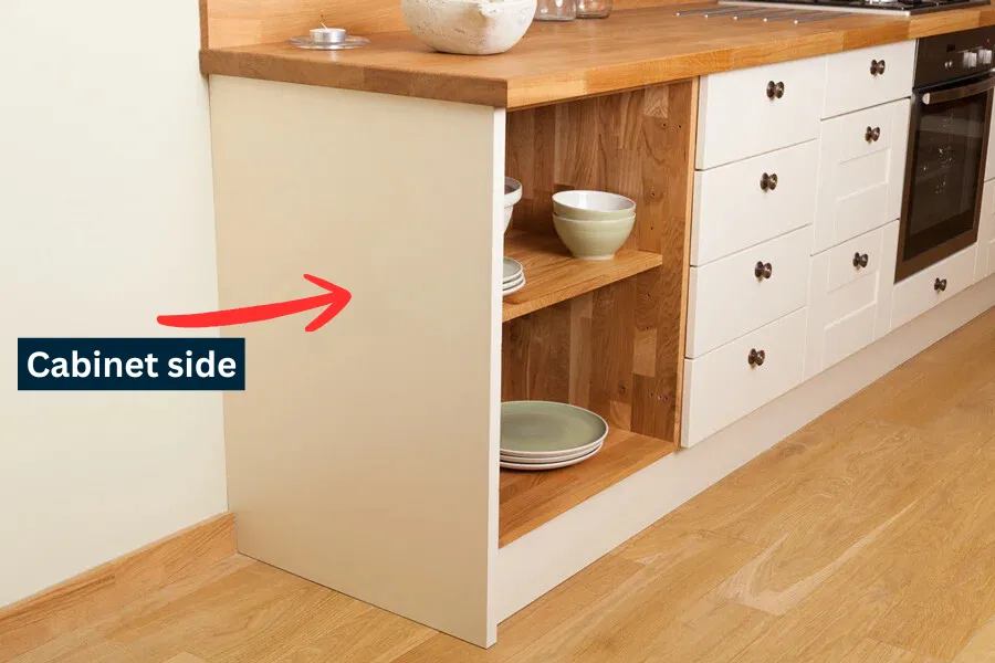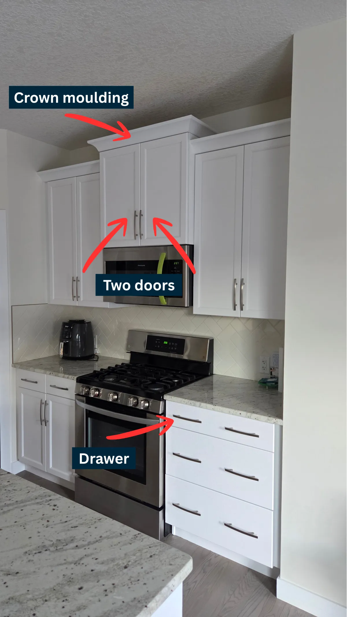 how big the cabinet doors are, whether they contain glass, if there is a pantry or kitchen island included, etc.
